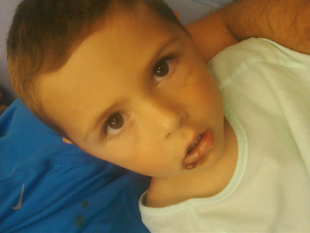 So, last week, Brenton hit his eye on the coffee table, leaving a black eye. Last night, he fell off the couch and ended up in the ER for 4 hours, leaving with 6 stitches. Needless to say, our livingroom is lacking a coffee table tonight.